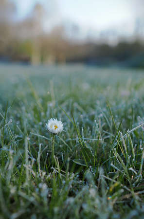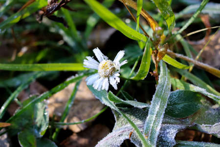 A daisy flower in a lawn with frost.