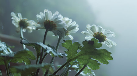 The Cineraria in light fog, dew on leaves, light soft diffused, three-quarter view