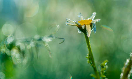 wild daisy flower with drops of morning dew, close-up.