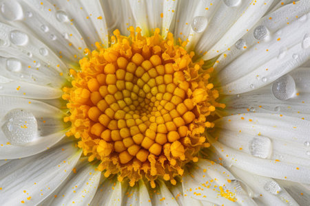 A detailed view of a pristine white petal flower featuring a luminous yellow core, set against a subtle, unobtrusive backdrop emphasizing its natural elegance.