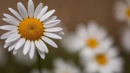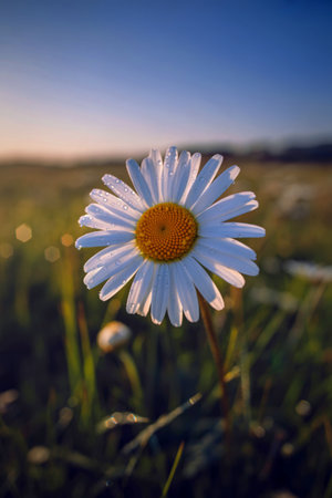 wild daisy flower with drops of morning dew, close-up.