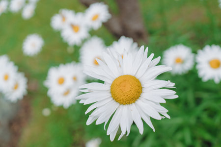 beautiful white small daisy on the background of green grass in the garden