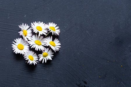Daisy beautiful chamomile flowers on dark. top view with copy space