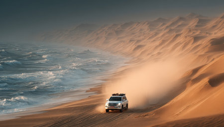 Off-road vehicle drives through sandy dunes by the ocean, stirring up dust clouds, with waves crashing nearby, capturing the spirit of adventure and exploration