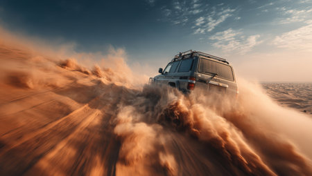 Experience the thrill of off-roading as a four-wheel drive vehicle races through a sandy desert, kicking up dust in a dramatic landscape under the sun.