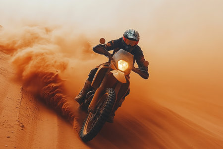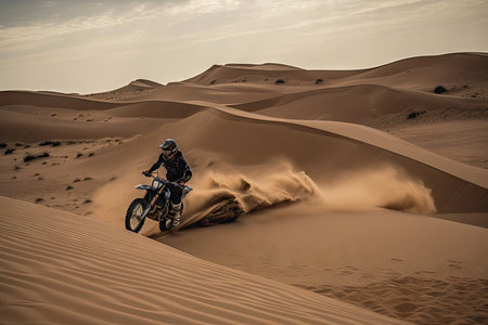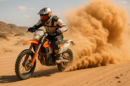 A thrilling scene of a rider expertly maneuvering a dirt bike across a sandy desert, creating clouds of dust under a bright blue sky, showcasing adventure and excitement.