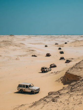 A stark desert scene features several abandoned vehicles partially buried in sand, highlighting the isolation and desolation of the landscape.