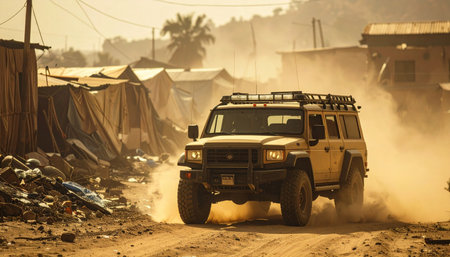 An AI generated illustration of an all-terrain vehicle driving through a dusty and muddy road