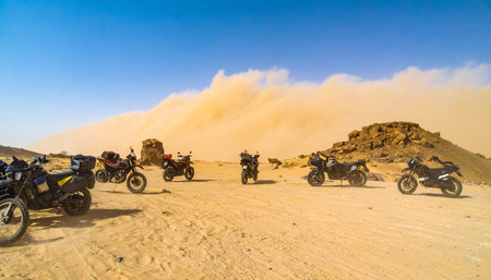A group of adventure motorcyclists takes a break on their off-road expedition, pausing as a massive sandstorm billows across the desert horizon.
