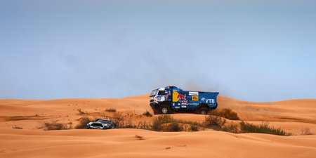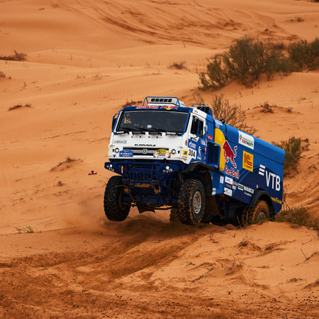 Sports truck KAMAZ gets over the difficult part of the route during the Rally raid in sand. THE GOLD OF KAGAN-2021. 04/26/2021 Astrakhan, Russia.