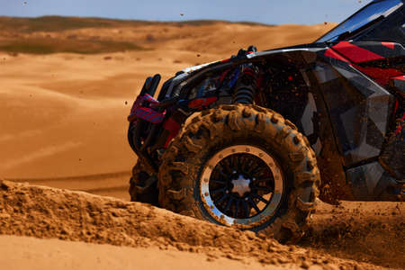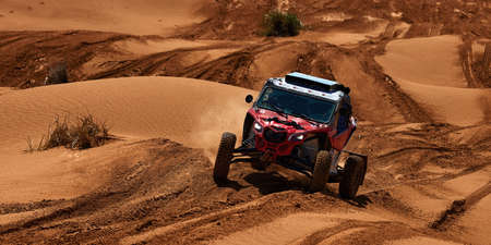 Off road buggys crossing dunes in the desert. Rally raid adventure.