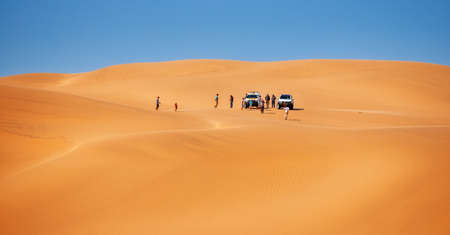 NAMIBIA- MAY 4, 2021: tourists traveling in Namibia, making a safari on the sand dunes of the Namib desert by cars