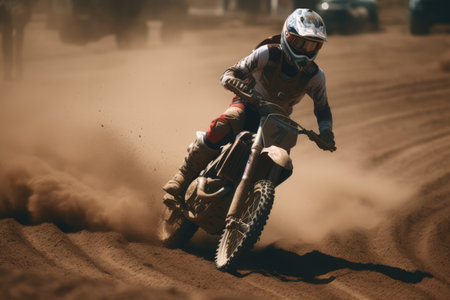 A drone shot of a motocross rider on a dusty track, showcasing adrenaline, sportsmanship, and extreme sports