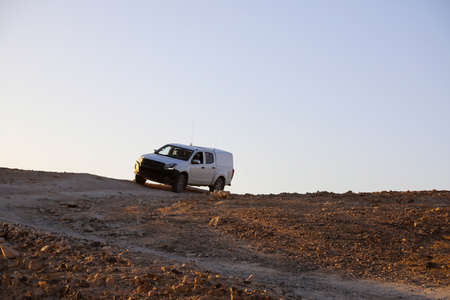 Wahiba Sands, Oman - 04.03.2018: Frontal shot of white Toyota offroad driving on a dirt road through Arabian desert with lots of dust and heat haze.