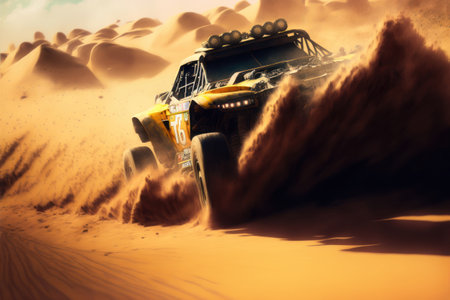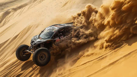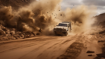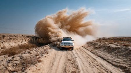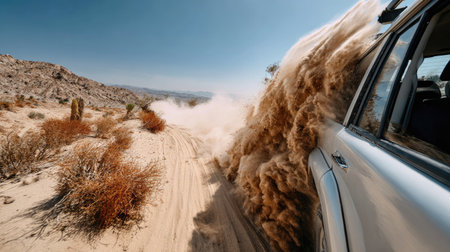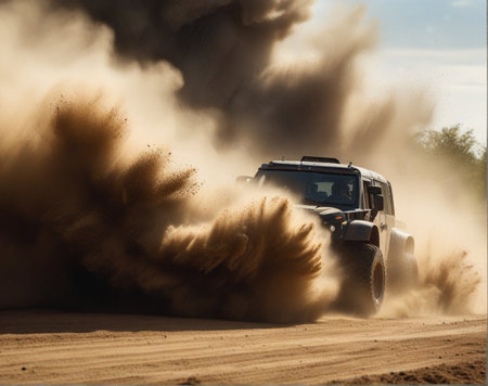 An exhilarating off-road adventure unfolds in a dusty desert landscape, as a vehicle kicks up sand clouds, capturing the thrill of exploration and freedom.