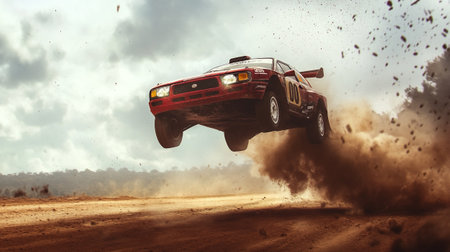 A wide shot captures a thrilling moment of a car accident during the Dakar Rally, showcasing dust and debris flying as the vehicle catches air in a dramatic off-road scene.