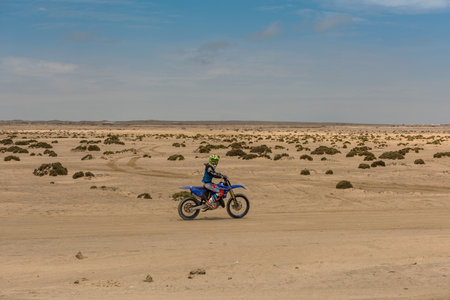 Motorcyclist on a dirty road in the Namib Desert, Namibia