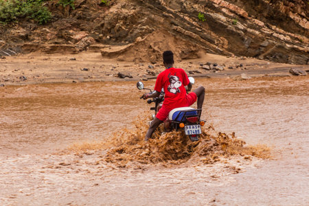 OMO VALLEY, ETHIOPIA - FEBRUARY 4, 2020: Local boy on a motorbike crossing swollen waters of Kizo river, Ethiopia