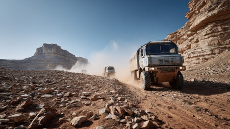 Experience the thrill of off-road racing with dynamic vehicles kicking up dust in a spectacular desert landscape, highlighting adventure and speed.