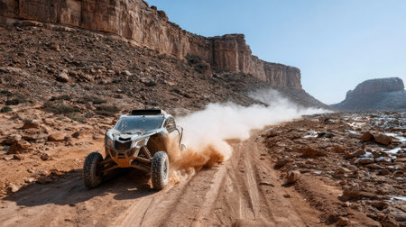 A dynamic scene of a rugged off-road vehicle speeding along a sandy trail, sending up clouds of dust in a dramatic desert environment.