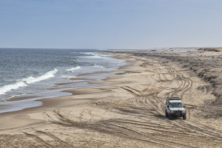 4x4 Jeep on the wild beach of the Namibe Desert. Angola. Africa.
