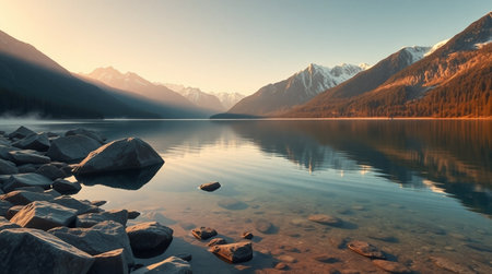 Beautiful alpine lake with mountains reflected in water at sunrise.