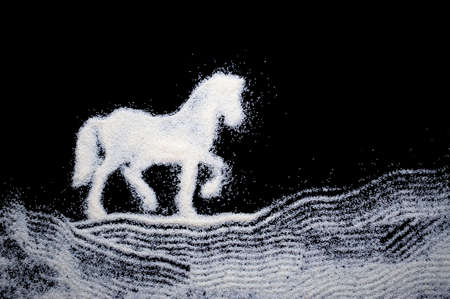 Drawing of a horse, white sand on a black background.