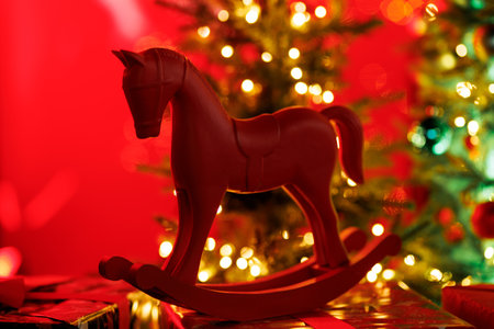 A traditional, stylized red rocking horse toy sits atop a wrapped gift box, set against a blurred background of a brightly lit Christmas tree.
