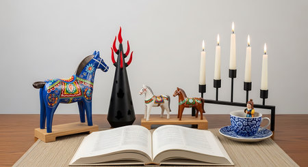 swedish dala horses on a pine wood surface, created with generative ai