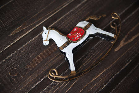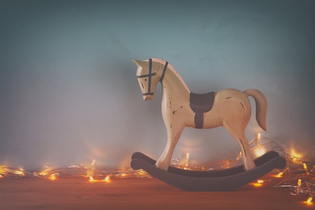 vintage rocking horse on wooden floor. Filtered image