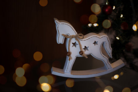 Christmas decoration white horse on a dark background con bokeh and copy space for text.