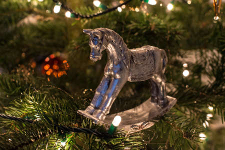 silver rocking horse christmas ornament on christmas tree