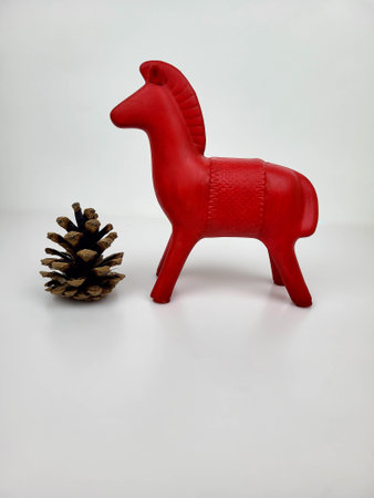A statuette of a red horse stands on a white surface next to a pine cone. New Year's symbol of 2026