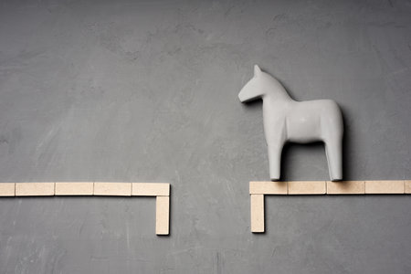 a gray toy horse stands on one side, there is no one on the other side. different sides of the bridge