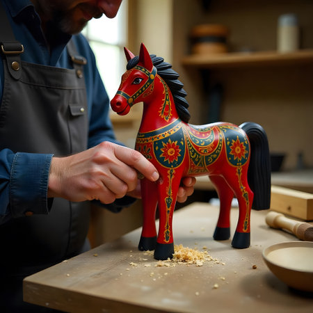 A skilled artisan meticulously paints a vibrant wooden horse figurine in a rustic workshop. The intricate details and rich colors highlight the craftsmanship.