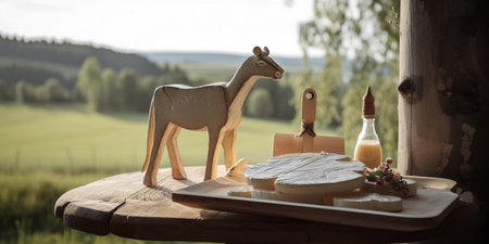 A wooden table topped with a cheese board and a horse figurine. AI generative image