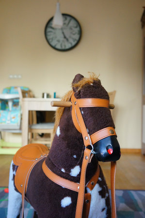 A closeup of a rocking horse in the room in the house