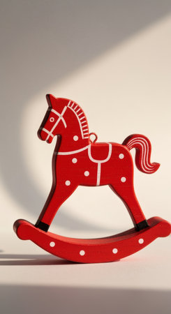 Classic red wooden rocking horse toy casting a soft shadow in bright sunlight against a neutral background.