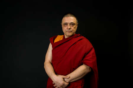 portrait of a Buddhist monk in a ritual red kesa robe for ceremonies
