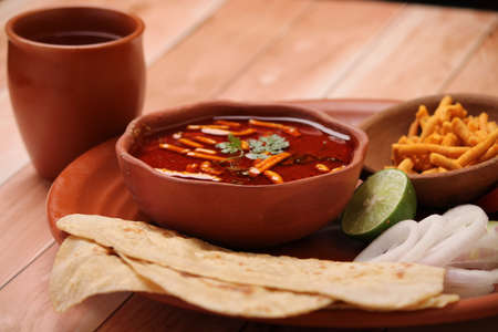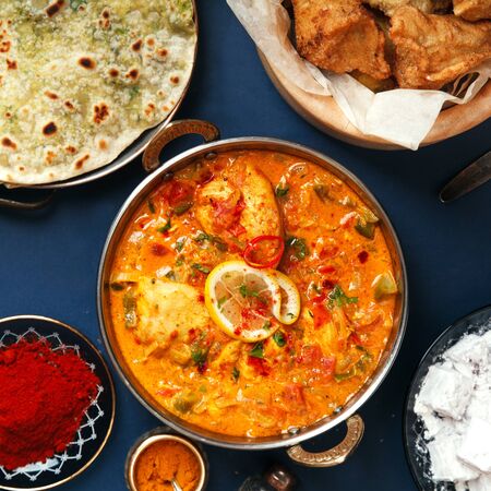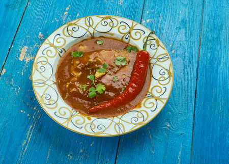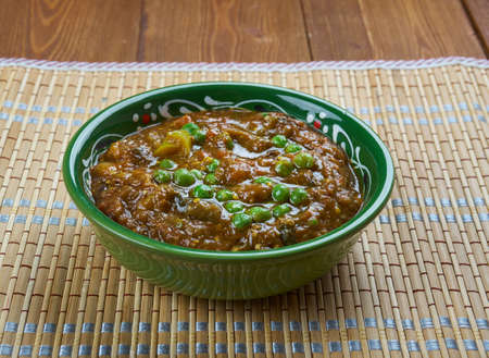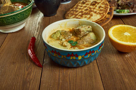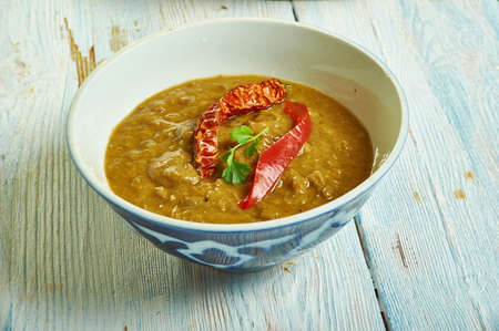Mirchi Korma , korma curry dishes, Kashmiri cuisine, Traditional assorted Indian dishes, Top view.