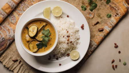 Delicious south Indian style mango curry with white rice, white background, top view