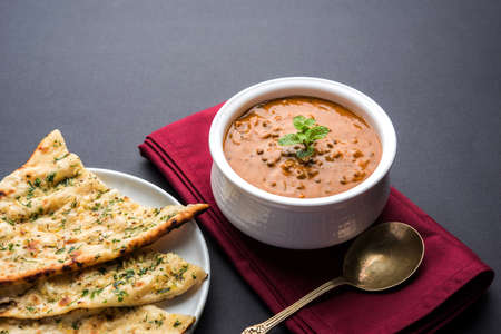 Dal makhani or dal makhni is a popular food from Punjab / India made using whole black lentil, red kidney beans, butter and cream and served with garlic naan or Indian bread or roti