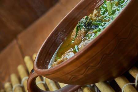 Nigerian cuisine - Ora Soup, Nigerian Bitterleaf Soup Traditional assorted dishes, Top view.