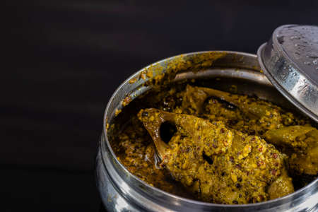 steamed ilish or hilsa fish with mustard paste in a steel tiffin box on black background