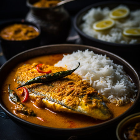 Experience the bold flavors and colors of Bangladesh with this spicy Hilsa fish curry dish! Tender pieces of Hilsa fish are cooked in a fragrant sauce made with turmeric, chili powder, and cumin, and served with fluffy white rice and a refreshing salad of cucumber and tomatoes. The bustling and colorful street food scene in the background adds to the festive atmosphere of this flavorful meal.