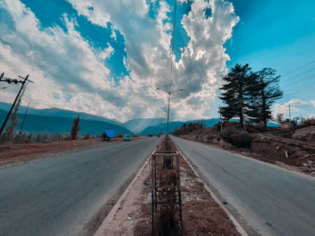 shot at sunset Highway leading to town in semi-arid landscape in the state of Hidalgo