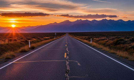 An asphalt road stretches towards distant mountains under a vibrant, colorful sky. The composition emphasizes converging lines and a low-angle perspective. Warm colors dominate the scene, suggesting a sunset or sunrise. This image could be used for various commercial or editorial purposes, conveying travel or scenic themes.