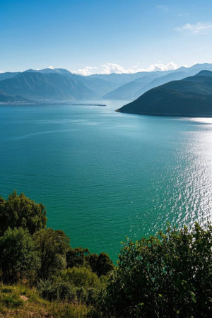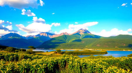 Outdoor lake scenery with mountains and rivers