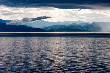 Storm with heavy rain and bright sun over the shore of lake