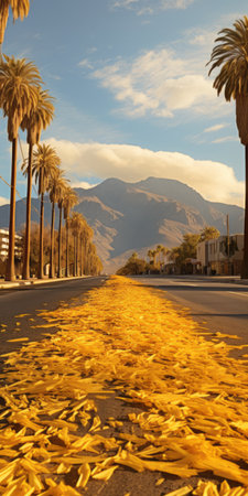 gingko boulevard in winter, lined with palm trees on both sides of the road. the golden color of the trees contrasts beautifully with the yellow palm biloba covering the ground. in the distance, a mountain adds to the scenic view. this real shot captures the clear surroundings and offers an ultra-high resolution image. ai generated